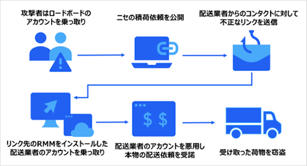 攻撃者はまず、掲示板の登録ユーザーである仲介業者のアカウントを侵害して乗っ取る。そして同アカウントから偽の貨物情報を投稿し、輸送業者から問い合わせが寄せられると、これに対して悪意のあるURLをメールで送る。このURLを輸送業者がクリックすると、遠隔からの監視・管理を可能にするRMM (Remote Monitoring and Management)ツールがインストールされる。これは正規のソフトウェアであるため、ネットワーク上またはウイルス対策ソフトウェアにおける検知が難しい。[25]
