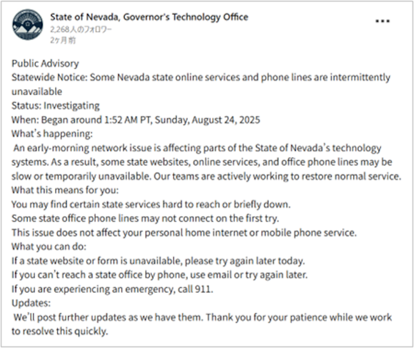 [16] 出典: LinkedIn 『State of Nevada, Governor's Technology Office: Nevada State Services Down Due to Network Issue』