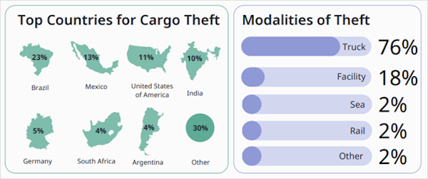 貨物窃盗とは、輸送中や保管中の貨物を不正に盗み取る行為である。ブラジル、メキシコ、米国、インド、ドイツ、南アフリカ等、複数の国々で問題となっており、物流網に依存する企業や個人に影響を与えている。組織犯罪グループによる貨物窃盗は何十年も前から続いており、米移民関税執行局は、(おそらく米国関連に限定した上で)この犯罪による損失額は年間150~350億ドルと推定している。[23] 近年では手口が巧妙化し、オンラインで荷主や輸送業者に成りすますサイバー犯罪が、主に北米で確認されている。世界全体のサプライチェーンにおいては、2024年に発生した貨物窃盗の76%が、陸上輸送中のトラックに関係していた。