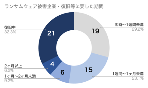 ランサムウェアに感染すると、基幹システムや共有ファイルが暗号化され、業務プロセスが完全に停止する可能性があります。警察庁の発表によると、被害の復旧に「1ヶ月以上」を要した企業が半数近くに上っており、その間の機会損失は甚大です。