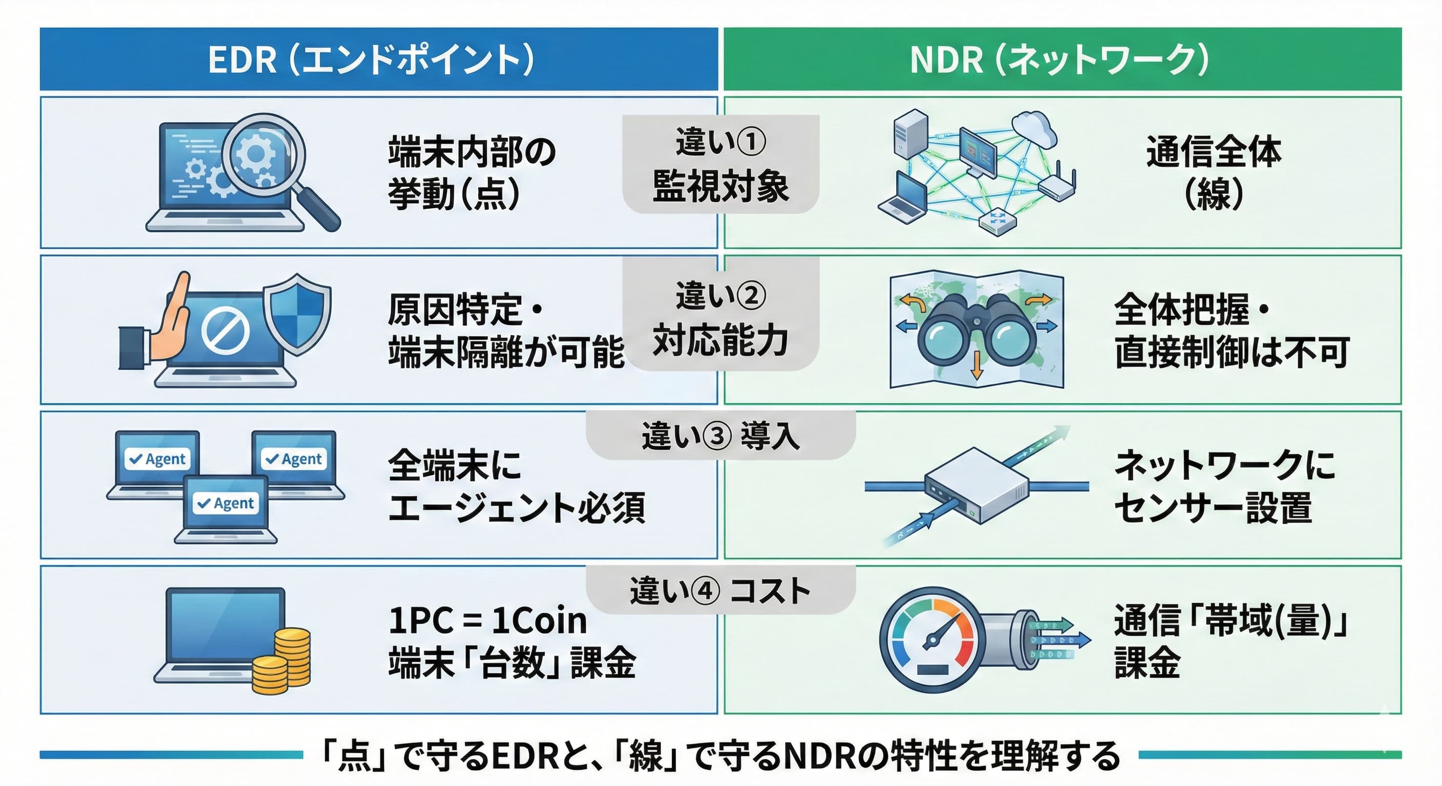 導入・運用の考慮点 | 全ての監視対象端末へのエージェント導入・管理が必要 | ネットワーク監視ポイントへのセンサー設置が必要 |