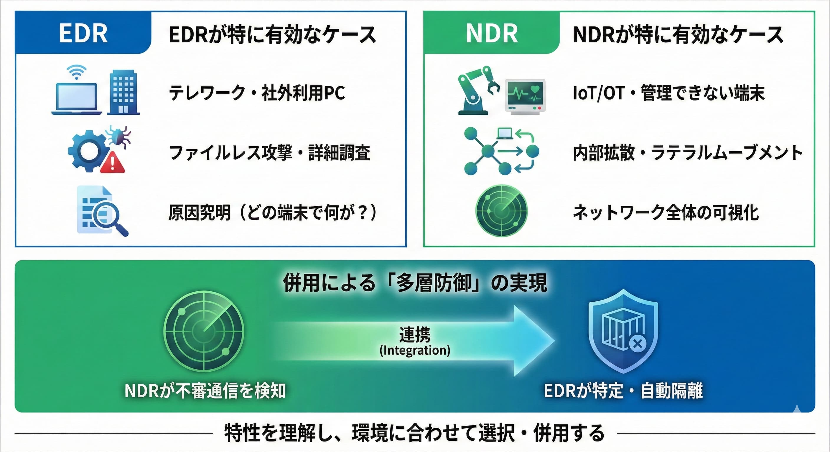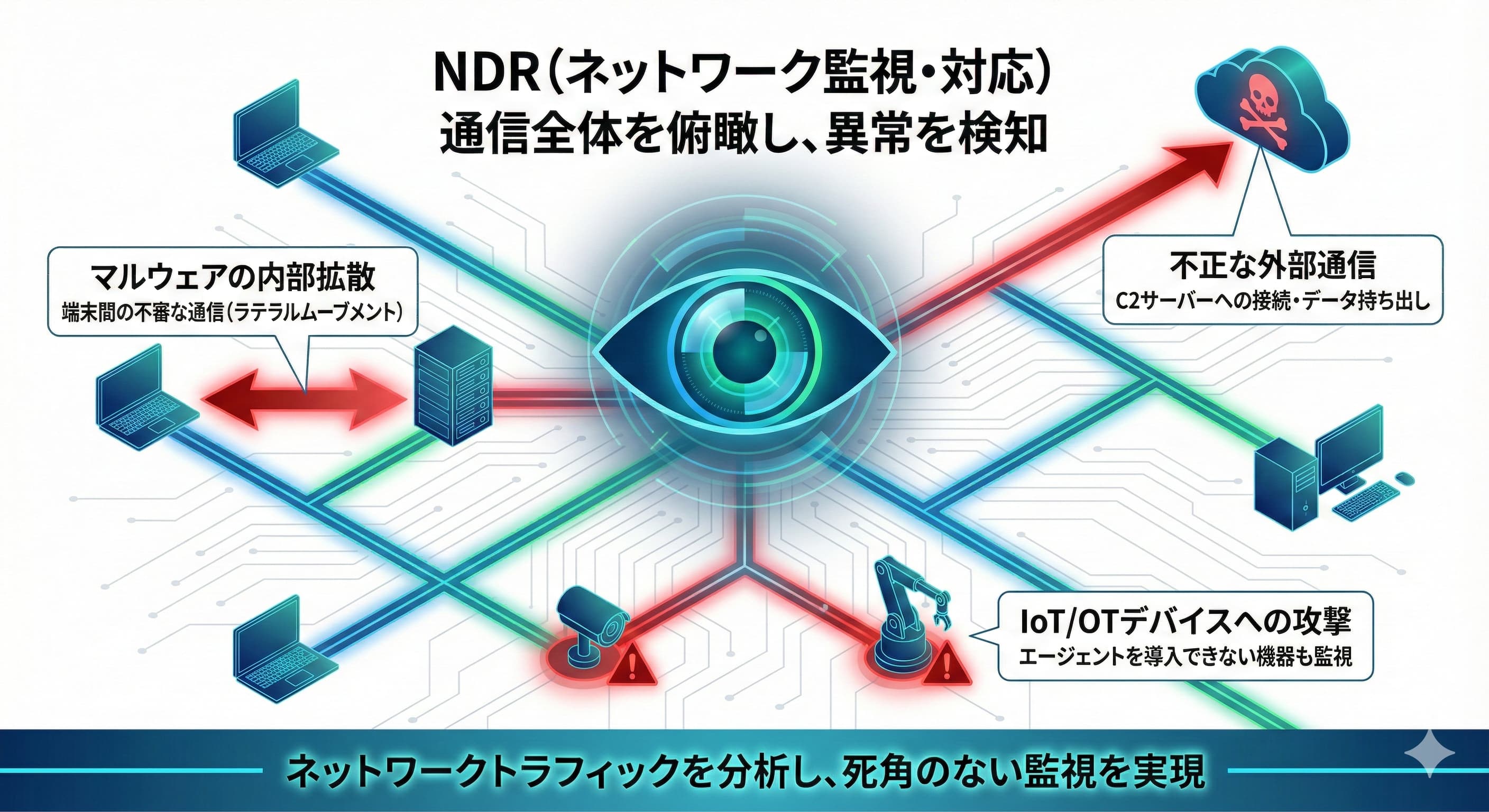 - NDR: デバイス間を行き交う「ネットワーク」全体の通信を監視します。これにより、マルウェアが他の端末へ感染を広げようとする動きなど、攻撃の広がりを捉えることを得意とします。