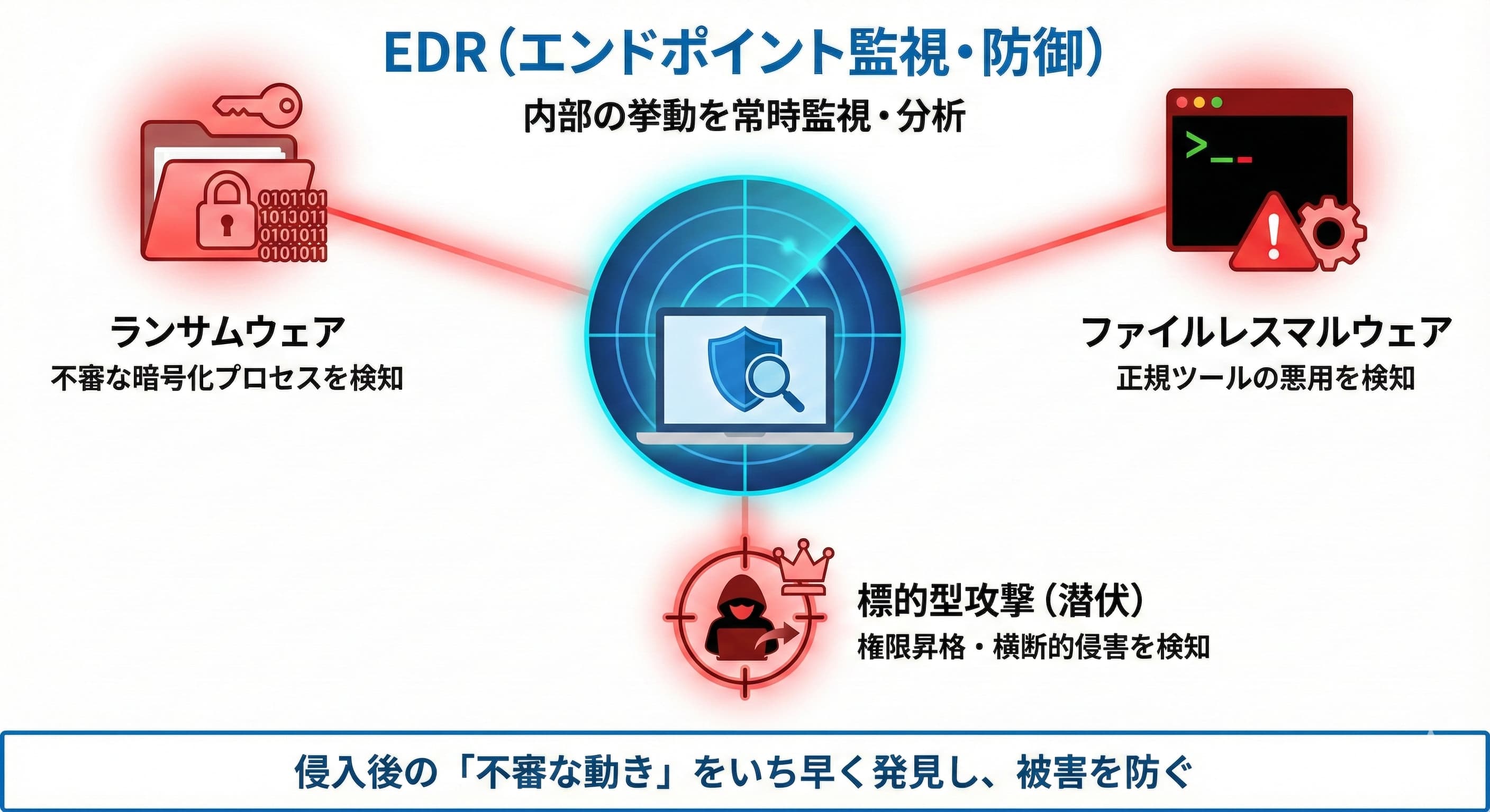 - EDR: PCやサーバーといった「エンドポイント」の内部動作を詳細に監視します。これにより、端末内での不正なプロセスの実行といった脅威の検知を得意とします。