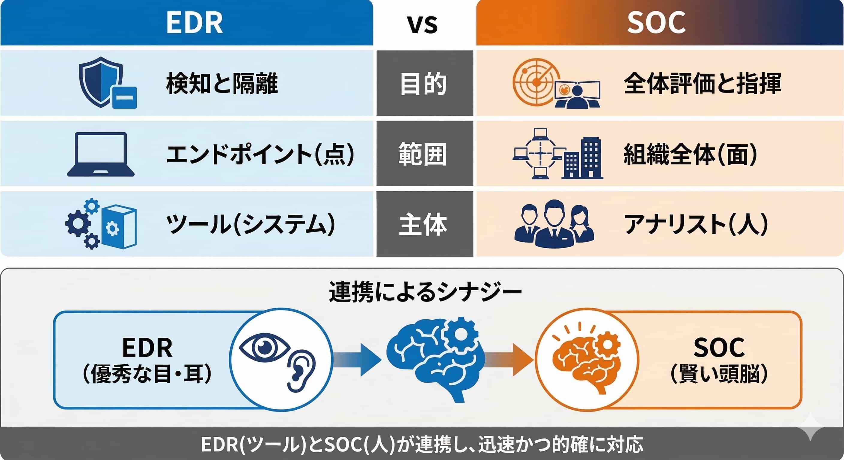 - SOC:エンドポイントに加えてネットワーク機器やクラウドサービスまで含めた組織全体を監視対象とし、「面」での防御を担います。