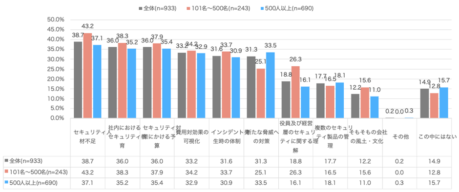 EDR導入で最も高いハードルが「運用」ですが、多くの企業がセキュリティ人材の確保に苦慮しています。当社の調査(従業員規模101名以上、情報システム担当者933名へのアンケート)では、全体の38.7%が「セキュリティ人材不足」を課題として挙げており、特に101~500名規模の企業では43.2%にものぼります。