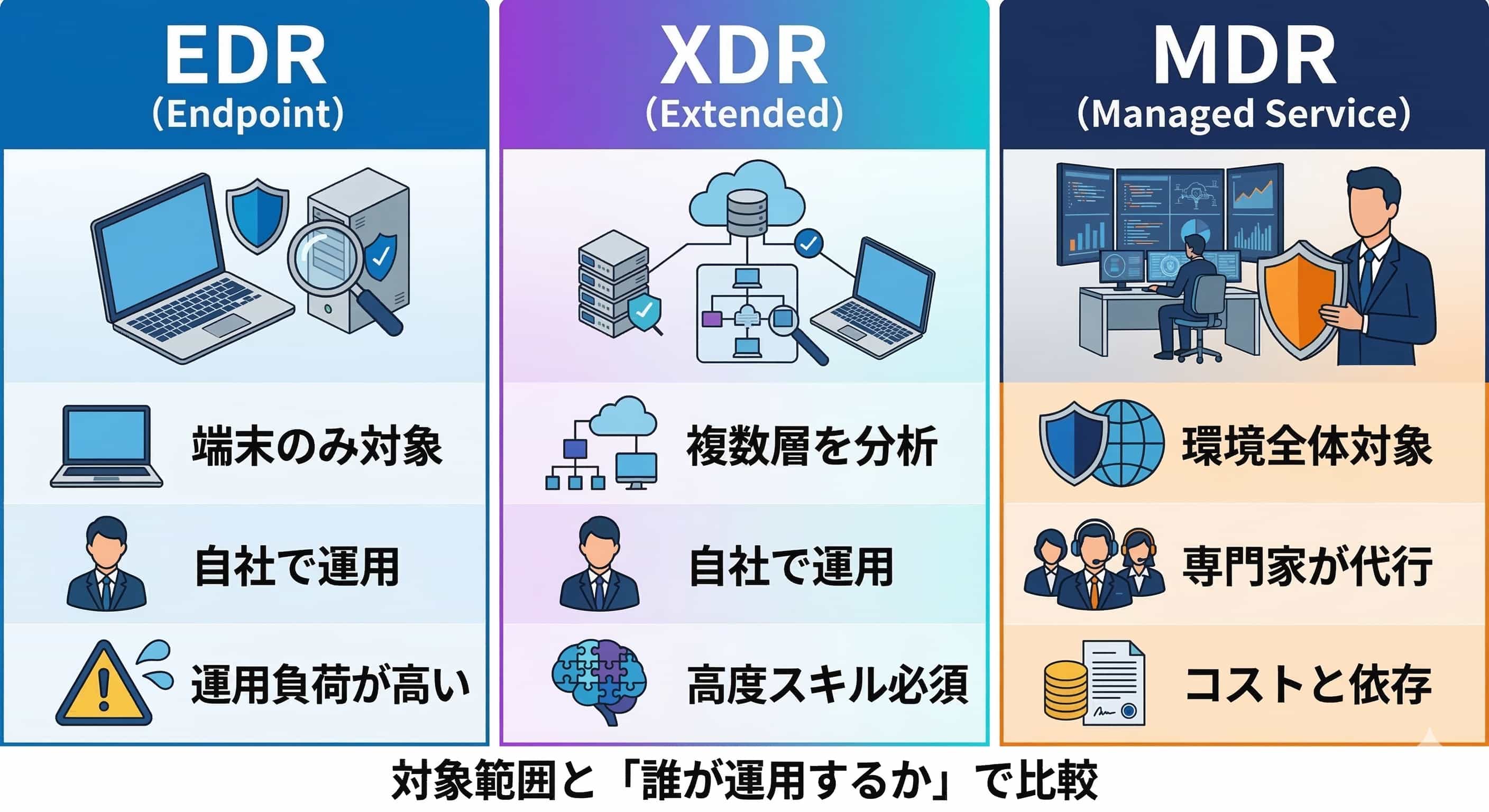 対象範囲 | エンドポイント | エンドポイント、ネットワーク、クラウド、メールなど複数レイヤー | 顧客環境全体(MDRサービス内容により異なる) |