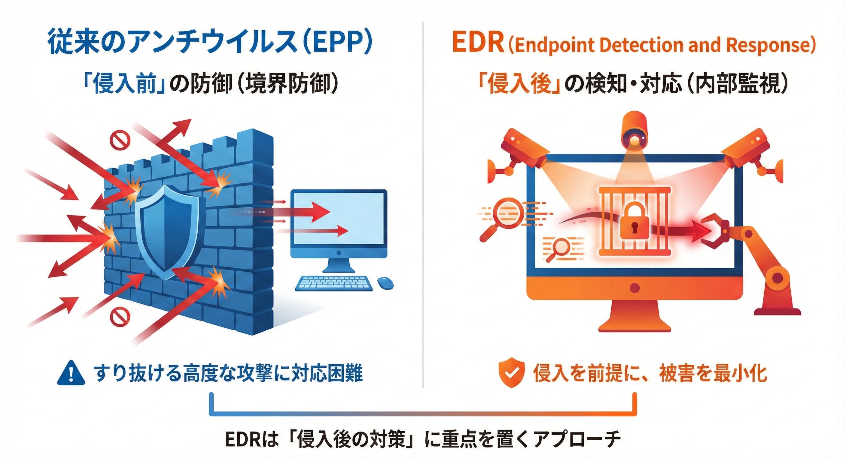 このように、EDRは境界型防御ではカバーしきれない内部での脅威に対し、被害の最小化を図る重要な役割を担っています。