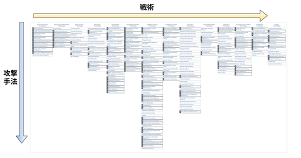 ATT&CKマトリクスは、横軸に「戦術」、縦軸に「攻撃手法」を配置した表です。左から右へ攻撃の進行段階を追いながら、各段階でどのような攻撃手法が使われるかを一覧できます。