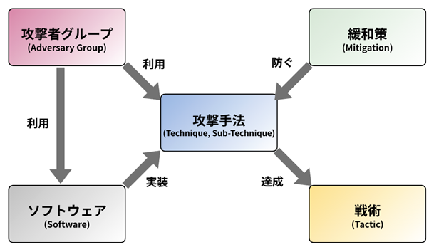 MITRE ATT&CKは、攻撃者の行動を以下の3つの要素で整理します。