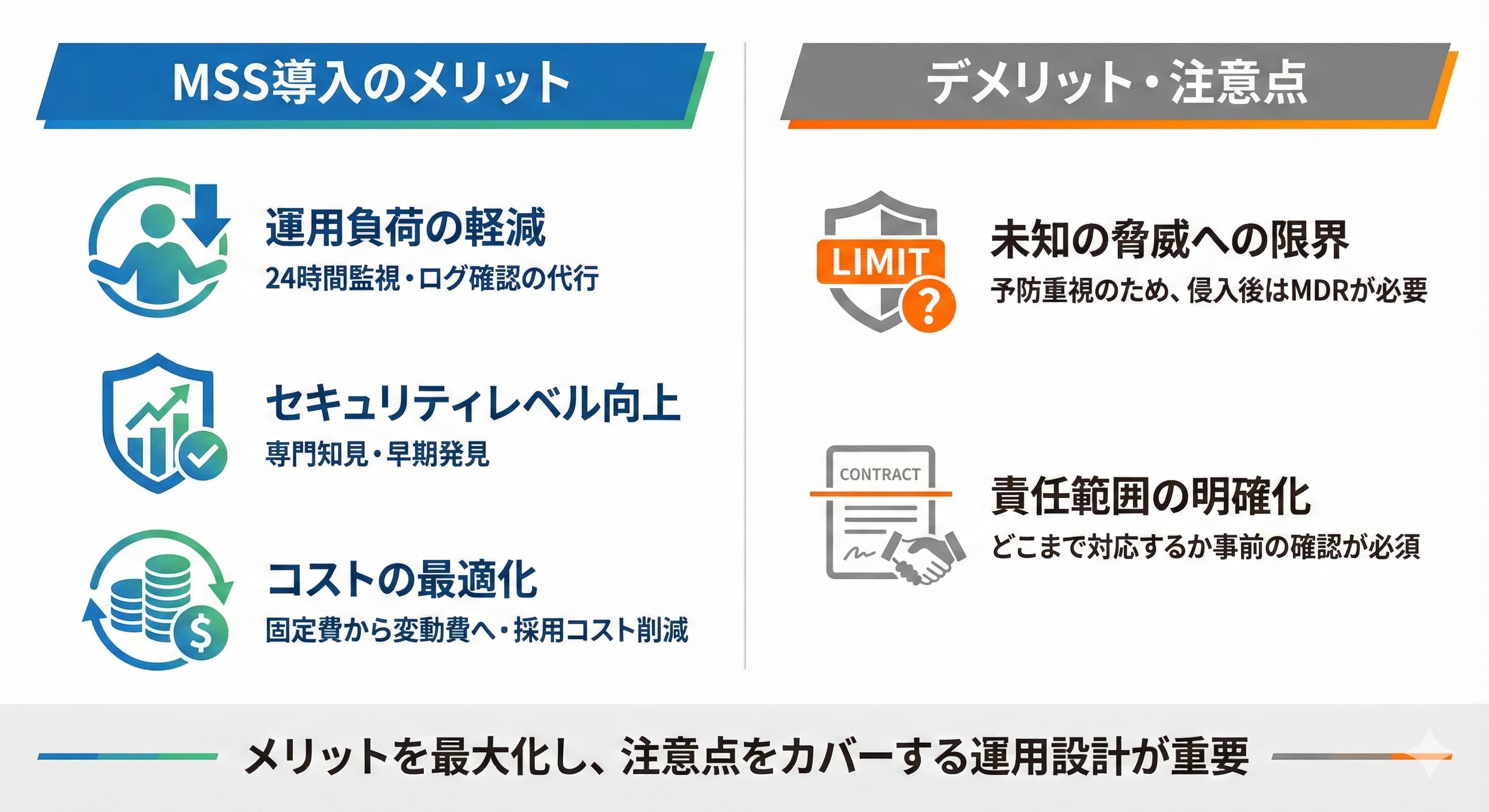 MSSは予防に重点を置くため、侵入後の対応には限界があります。MDRとの併用も検討しましょう。 - 責任範囲の明確化が必要