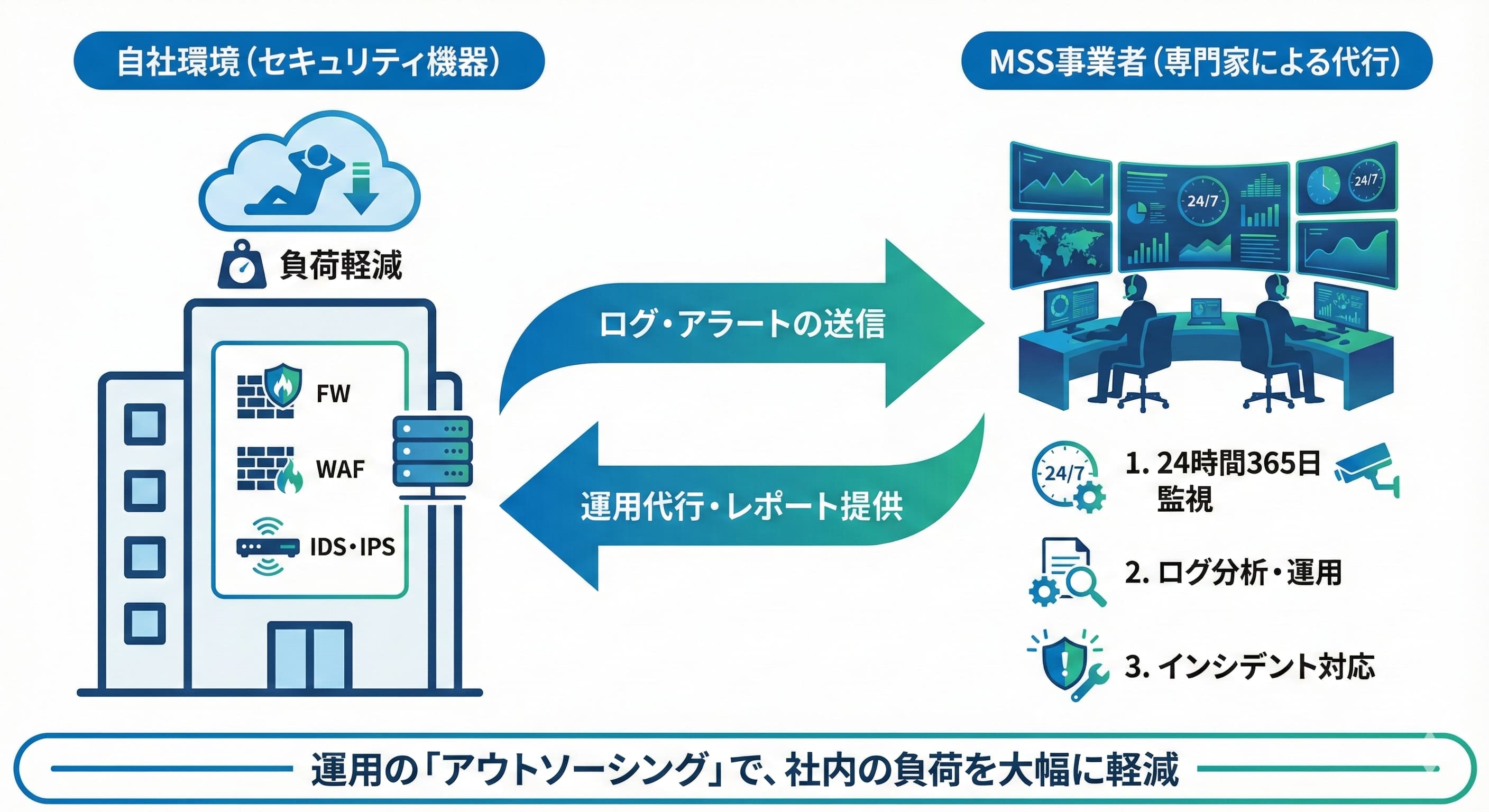 MSS(Managed Security Service)とは、ファイアウォールやWAF、IDS/IPS(不正侵入検知・防御システム)などのセキュリティ機器の運用・監視を、専門事業者が代行するアウトソーシングサービスです。24時間365日の監視体制、ログ分析、インシデント対応などを提供し、企業のセキュリティ運用負荷を大幅に軽減します。