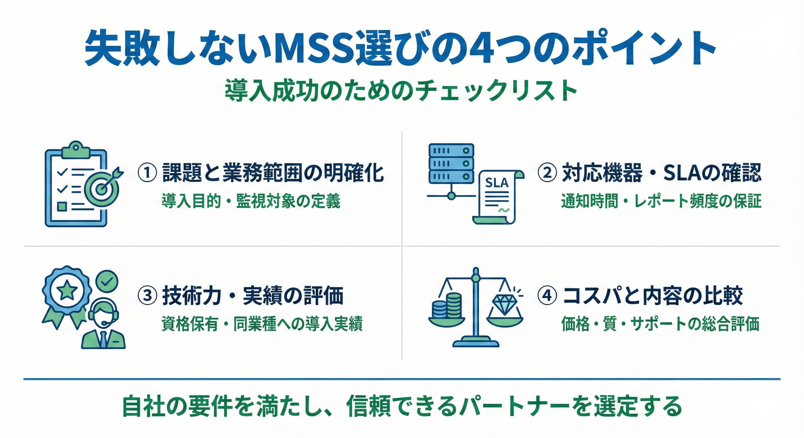 MSSの導入効果を最大化するには、自社の課題や目的に合ったサービスを慎重に選定することが不可欠です。以下の4つのチェックポイントを押さえることで失敗のリスクを最小限にします。