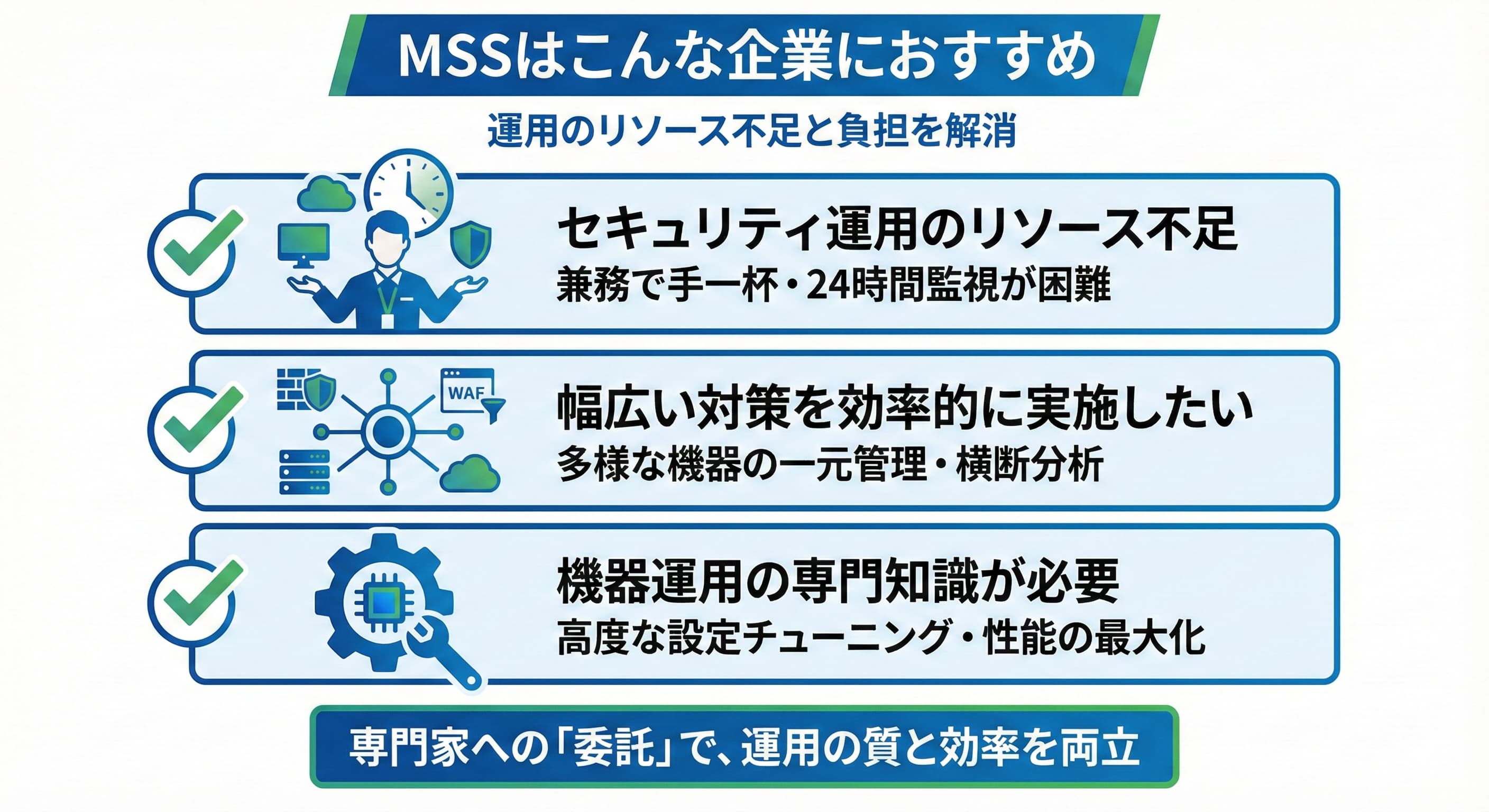 MSSは、特定の課題を抱える企業にとって特に有効なソリューションです。以下のようなケースではMSSの導入が大きな効果が期待できます。