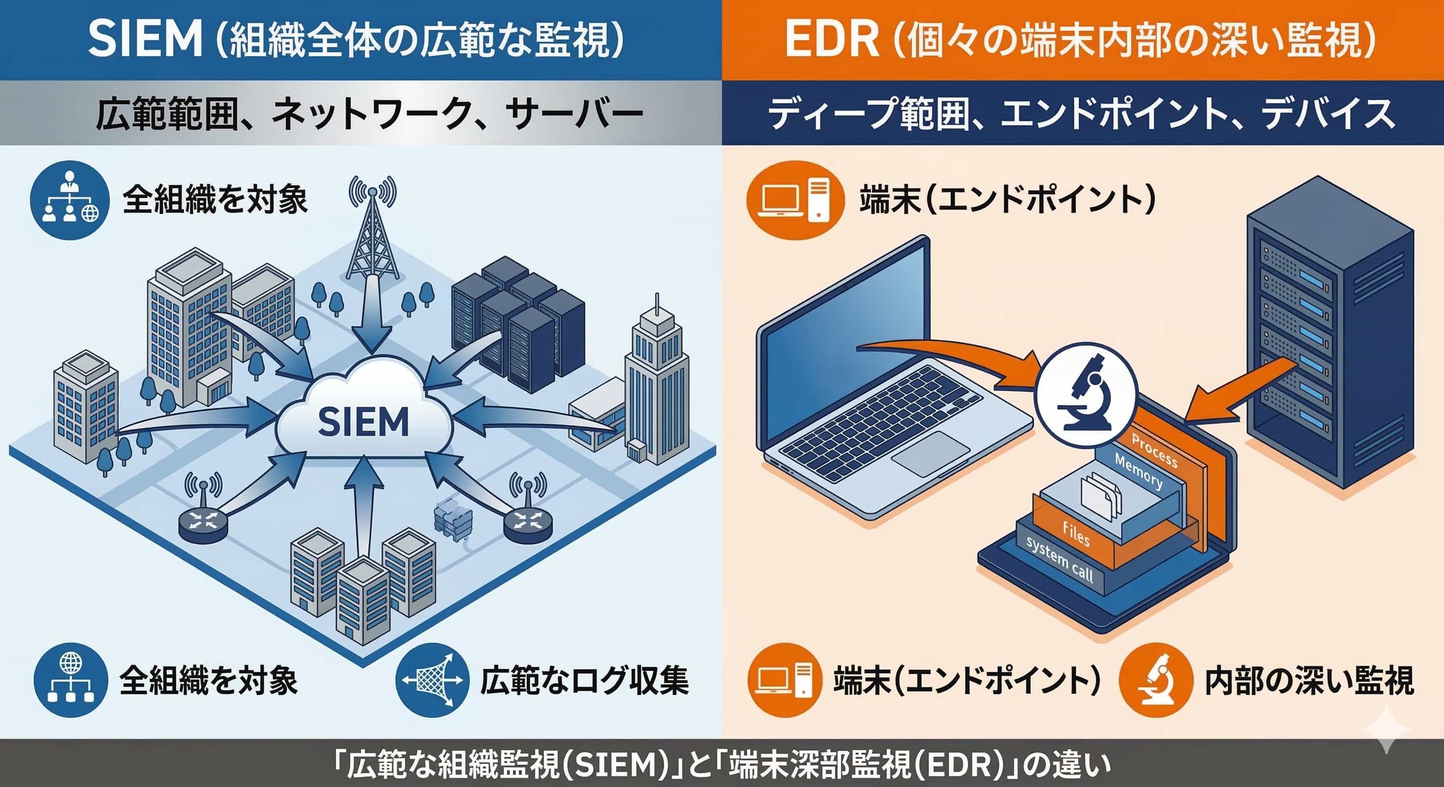 - SIEM:サーバーやネットワークなど、組織全体を広く監視