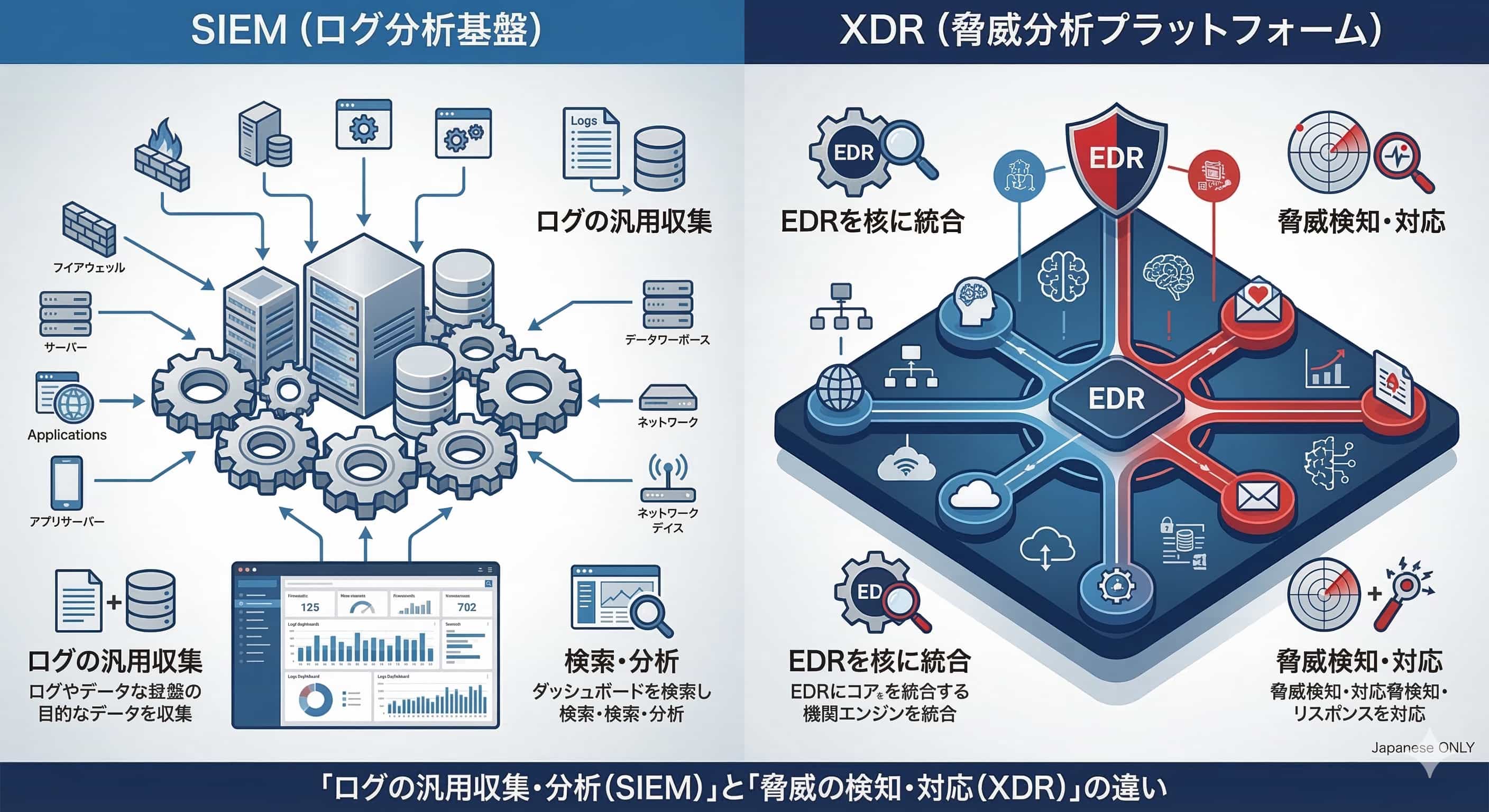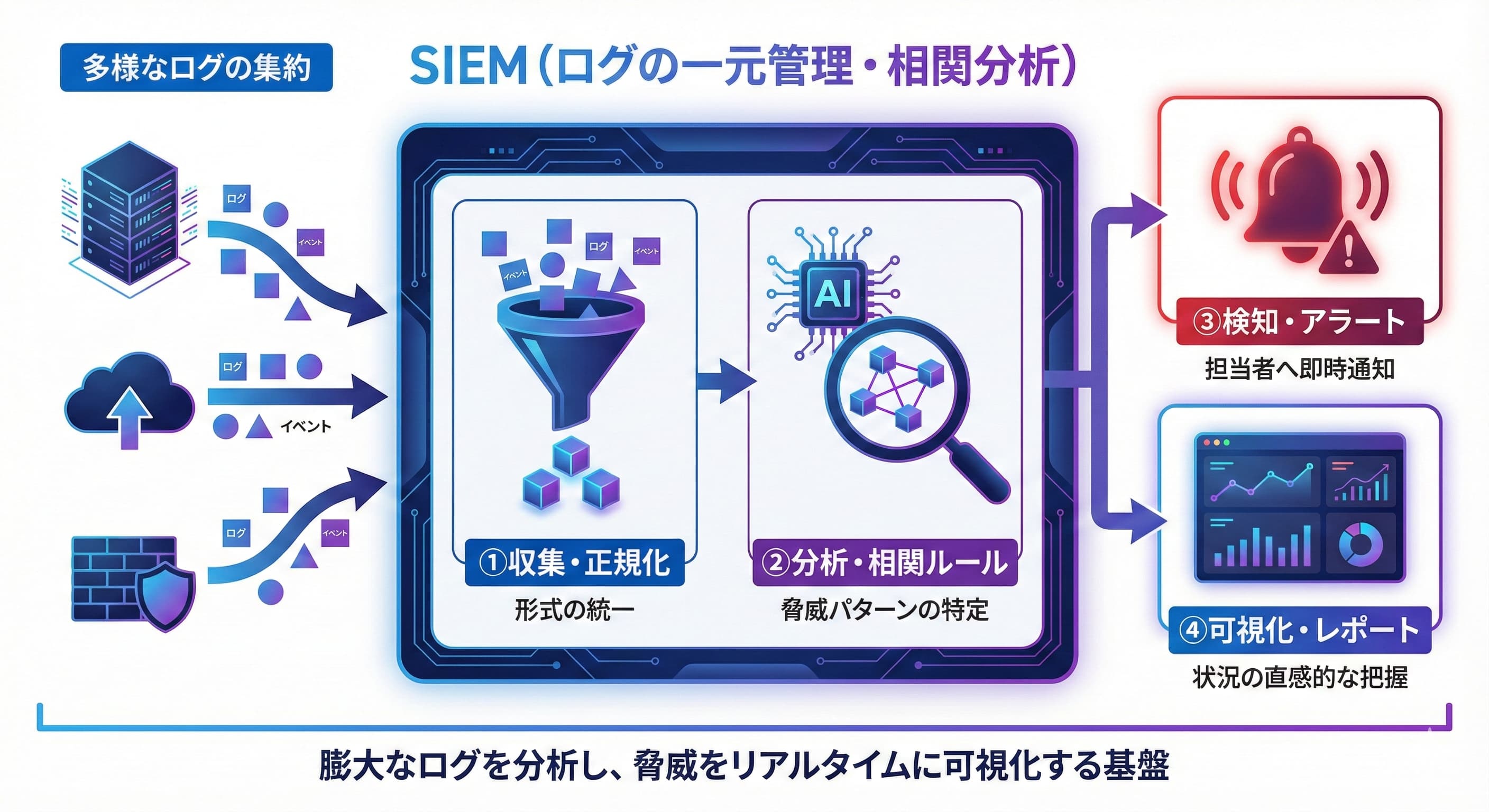 - SIEM:組織内のログを収集・分析し、脅威の兆候を検知する「ツール・基盤」