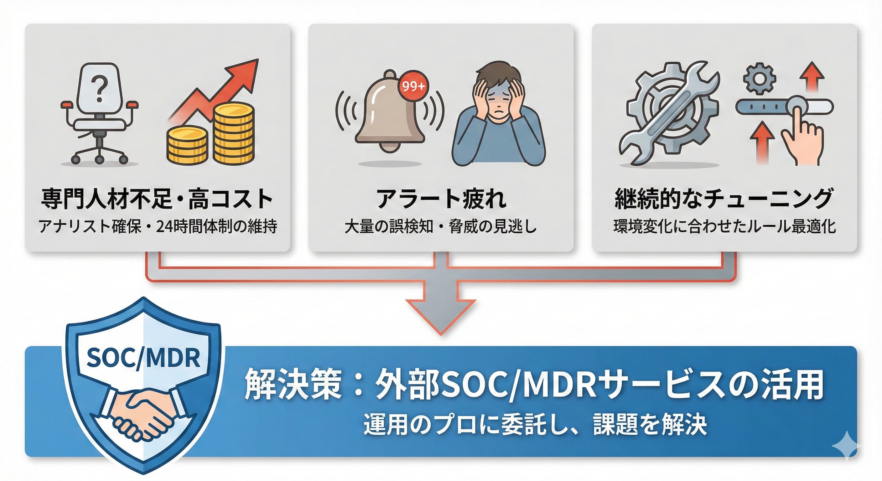 高度なスキルを持つアナリストの確保は困難で、24時間体制の維持コストも高額です。 - アラート疲れ: