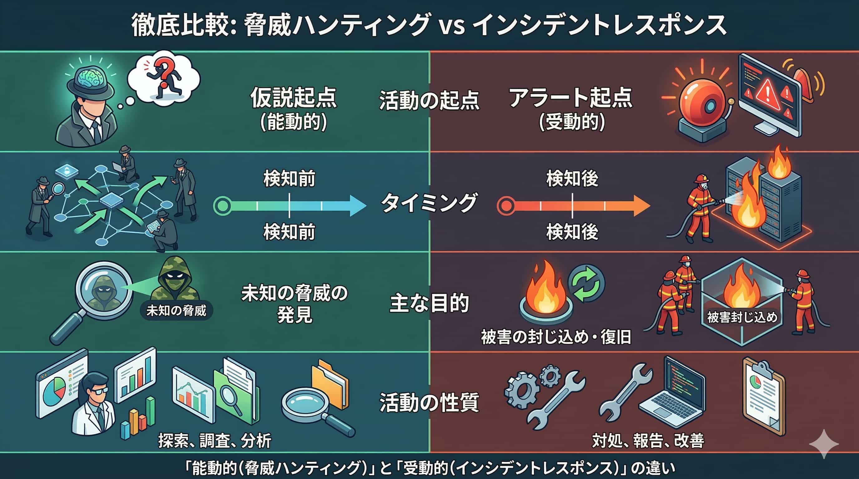 インシデントレスポンスは、セキュリティ製品が発したアラートや、ユーザーからの異常報告などを起点とする「受動的(リアクティブ)」な活動です。一方、脅威ハンティングは「攻撃者が潜んでいるかもしれない」といった仮説を起点とする「能動的(プロアクティブ)」な活動です。