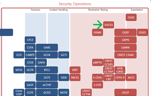Security Certification Roadmap - Paul Jerimy Media では、OSCE3や上記3つの資格は、OSEEの次に位置しています。OffSecの資格では、OSCP(PEN-200)が有名ですが、この図ではかなり下のほうに配置されていますね。