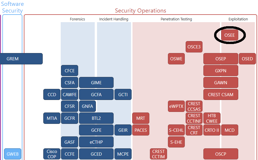 たとえば、さまざまなセキュリティ系の資格を分野別に並べているこちらのサイト Security Certification Roadmap - Paul Jerimy Media では、OSEEは一番エキスパート寄りに分類されていて、世界的にも最高難度の資格と考えられているようです。