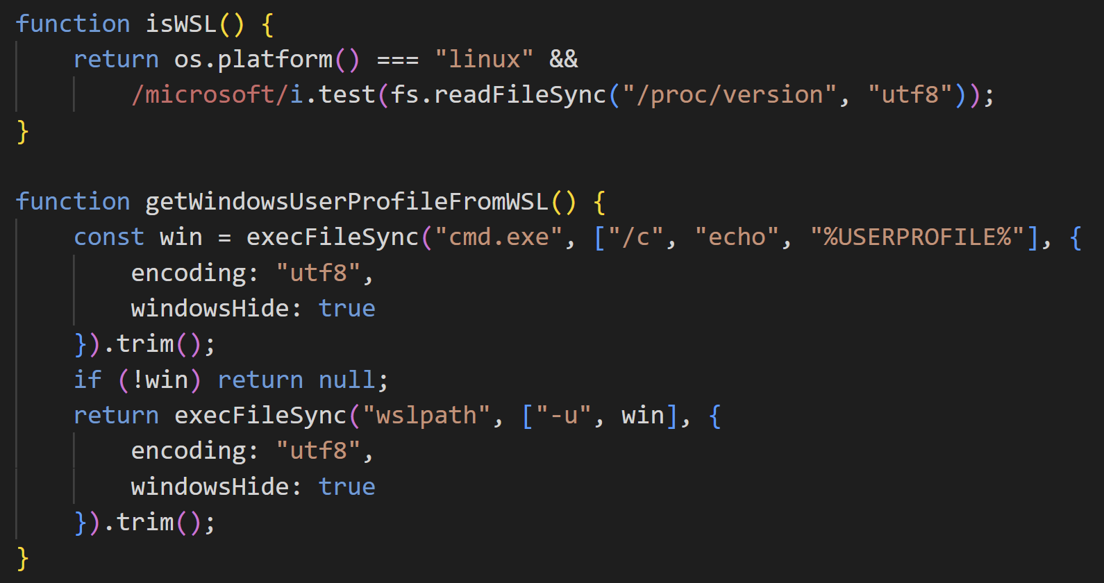 大変興味深いことに、Stealerモジュールは被害者端末がWSL環境かどうかチェックを行います。WSLの場合、Windows側のユーザプロファイルを取得し、wslpathを使ってLinuxのパスへ変換します。これによって、WSL上のNode.jsからWindows側のデータにアクセスすることが可能です。