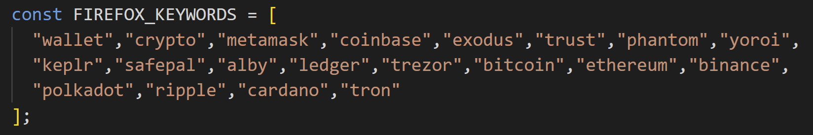 Firefoxの場合、保存されているクレデンシャルに加えて、ブラウザ拡張のデータを窃取します。extensions.jsonに書かれているブラウザ拡張の名前を取得し、予め定義されたキーワードが含まれているかチェックします。
