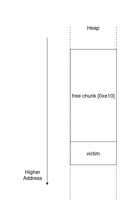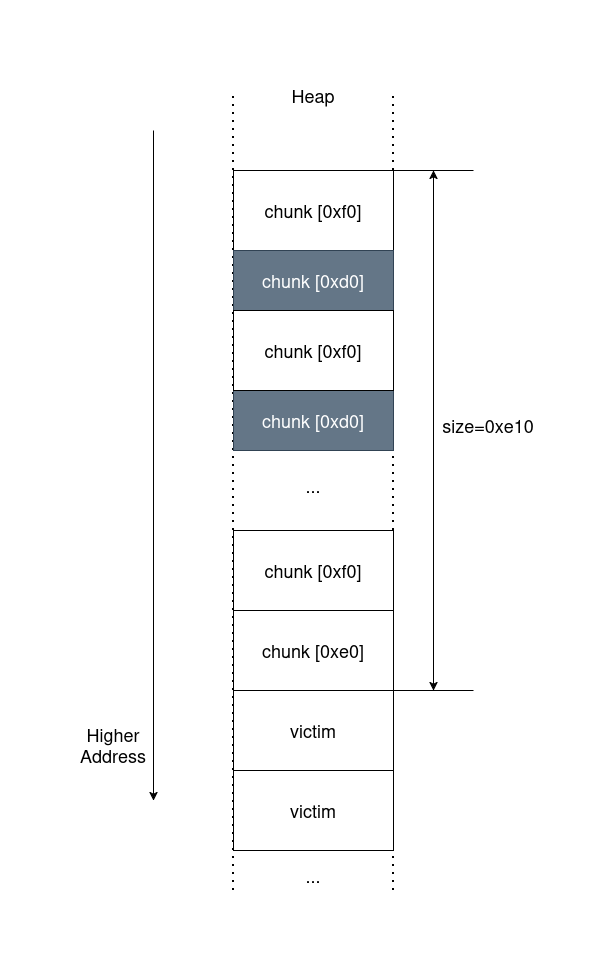 オーバーフローで書き込まれるチャンク(victim)を用意するには、 malloc(0xe00) を実行する前に下図のようにvictimの前に大きな空き領域を作っておく必要があります。