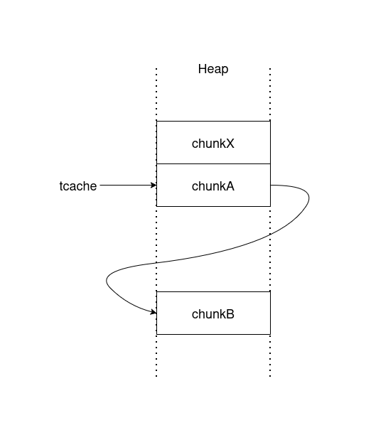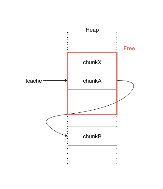 配置を作ることができたら、victimを含めて全部の領域を一旦すべてfreeします。同じサイズの開放チャンクは7個までtcacheに入るので、すべてtcacheに入ります。tcacheに入ったチャンクは結合されないので、図に示したチャンクのレイアウトは保たれます。