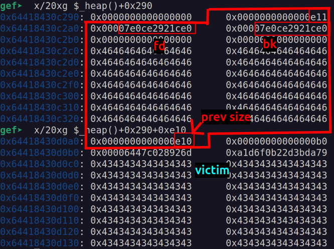 全部でvictimチャンク (サイズが他のチャンクとかぶらないようにする)がN個、0xd0チャンクが7個、0xf0チャンクが8個、0xe0チャンクが1個あります。 (1個だけ0xe0なのはトータルサイズを0xe10にするため。) 途中で確保チャンクの数が多くなってきたら、0xd0のチャンクを先に開放します。このときはtcacheに入るので、0xd0サイズを使わない限り再利用されず、結合もしません。