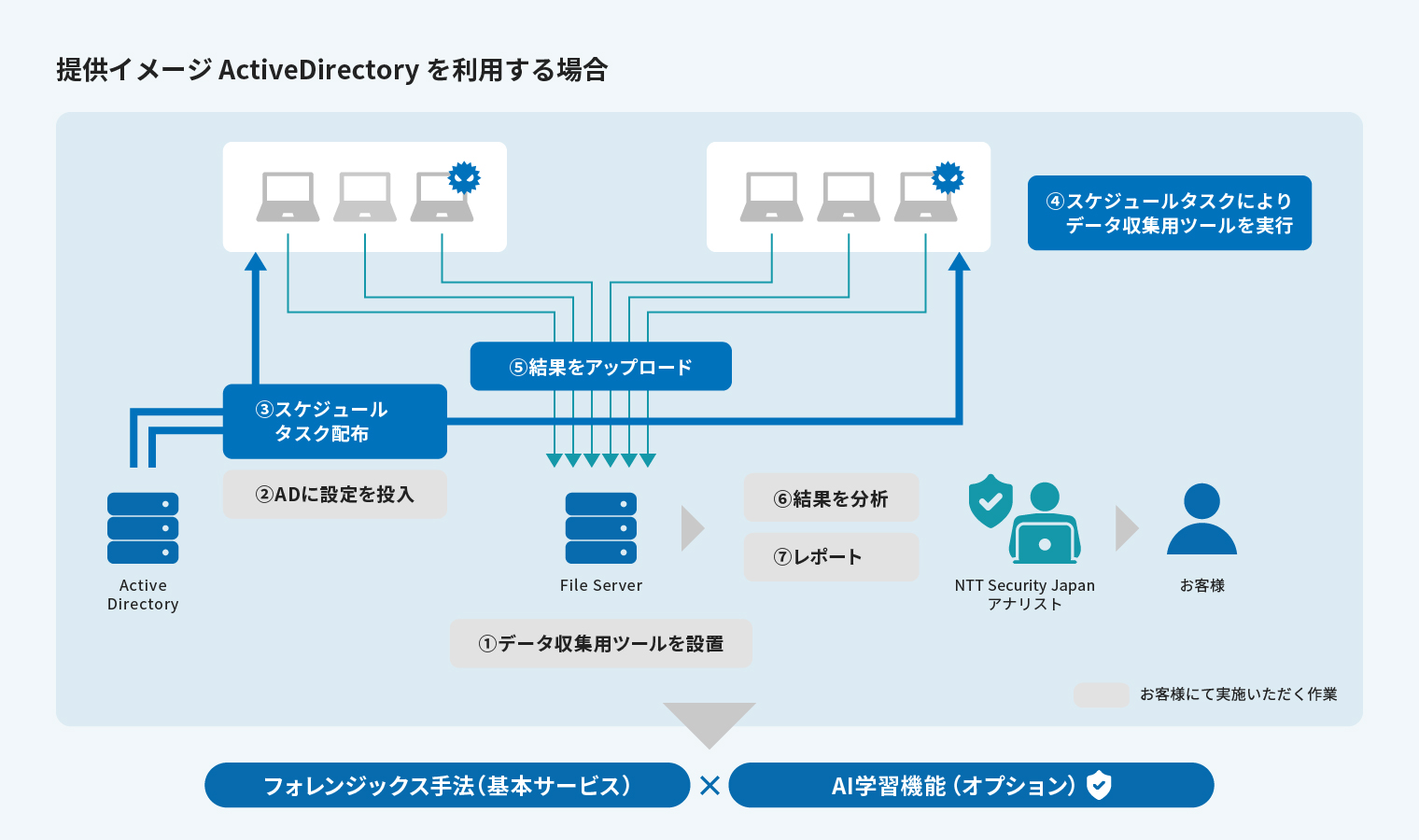 リソース負担を最小化: お客様はデータ収集ツールを実行するだけ。解析作業はすべて弊社の専門チームが担当するため、大規模な調査でもお客様の人的リソース負担を大幅に削減します。
