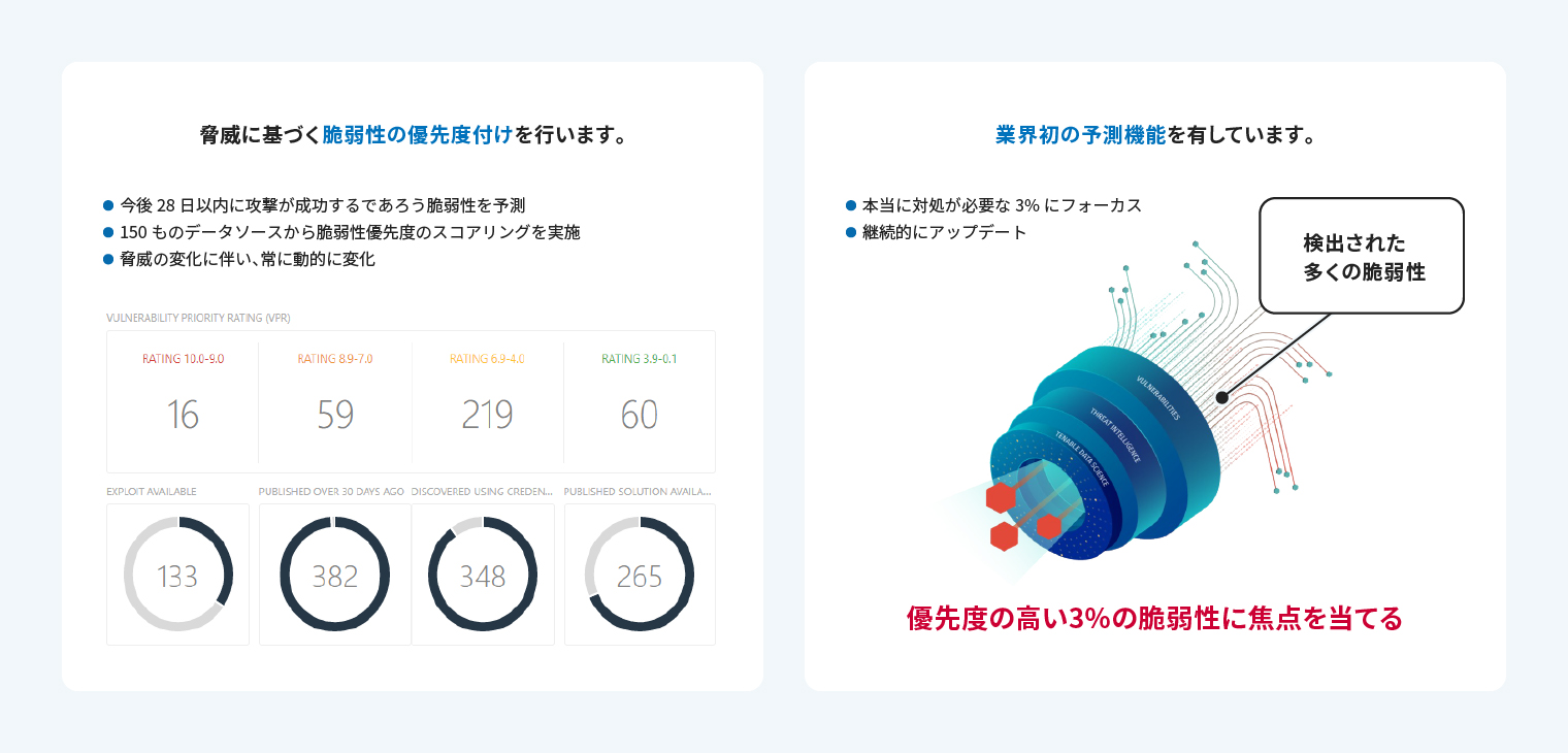 業界唯一の予測型優先度付け(VPR)機能は、発見された大量の脆弱性(CVSSスコアベース)のうち脅威情報やSNSの議論など150以上のデータソースを分析し、今後28日以内に攻撃に利用される可能性が高い脆弱性を正確に予測します。セキュリティチームは真に重要なリスクに集中できます。