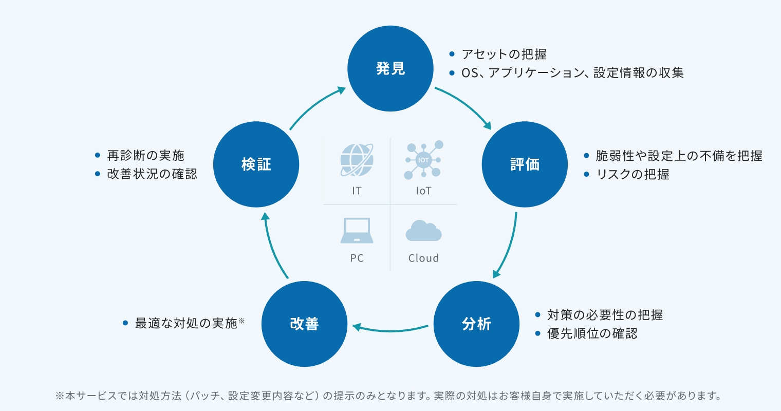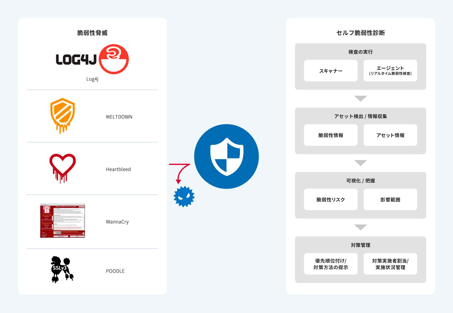 アセット情報の収集/脆弱性検出 によりすべてのアセットの 脆弱性リスクを把握・可視化 するとともに、発見された 脆弱性の対策を管理 することで、脆弱性脅威からアセットを守ります。