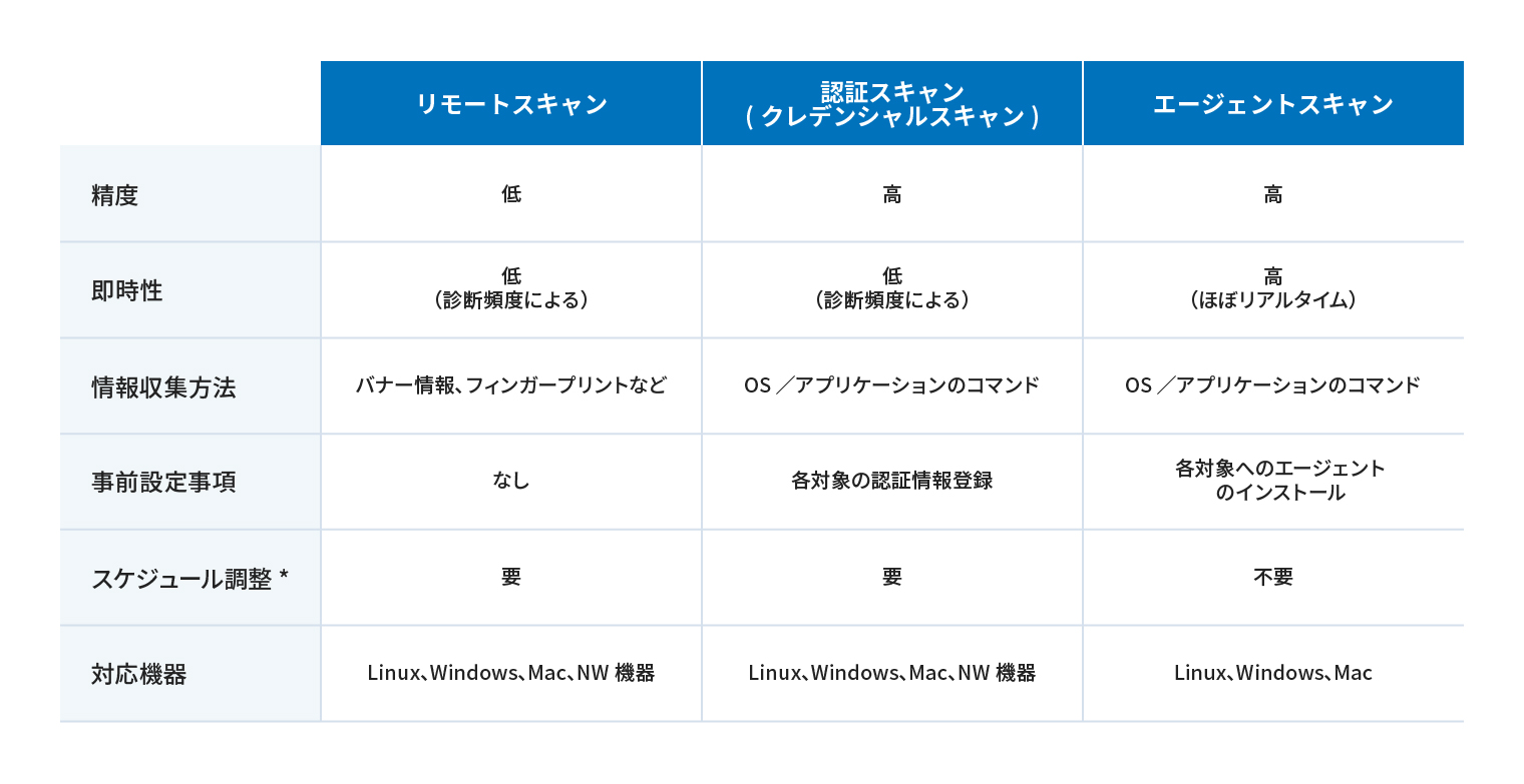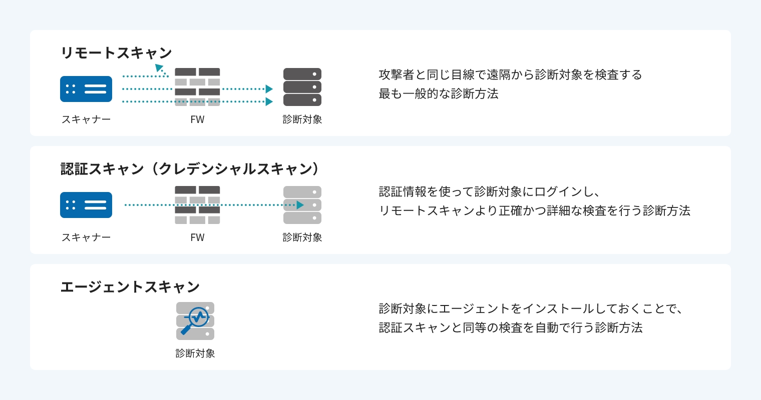 エージェント〉認証スキャン 〉リモートスキャンの順番で高度な検査が可能になります。