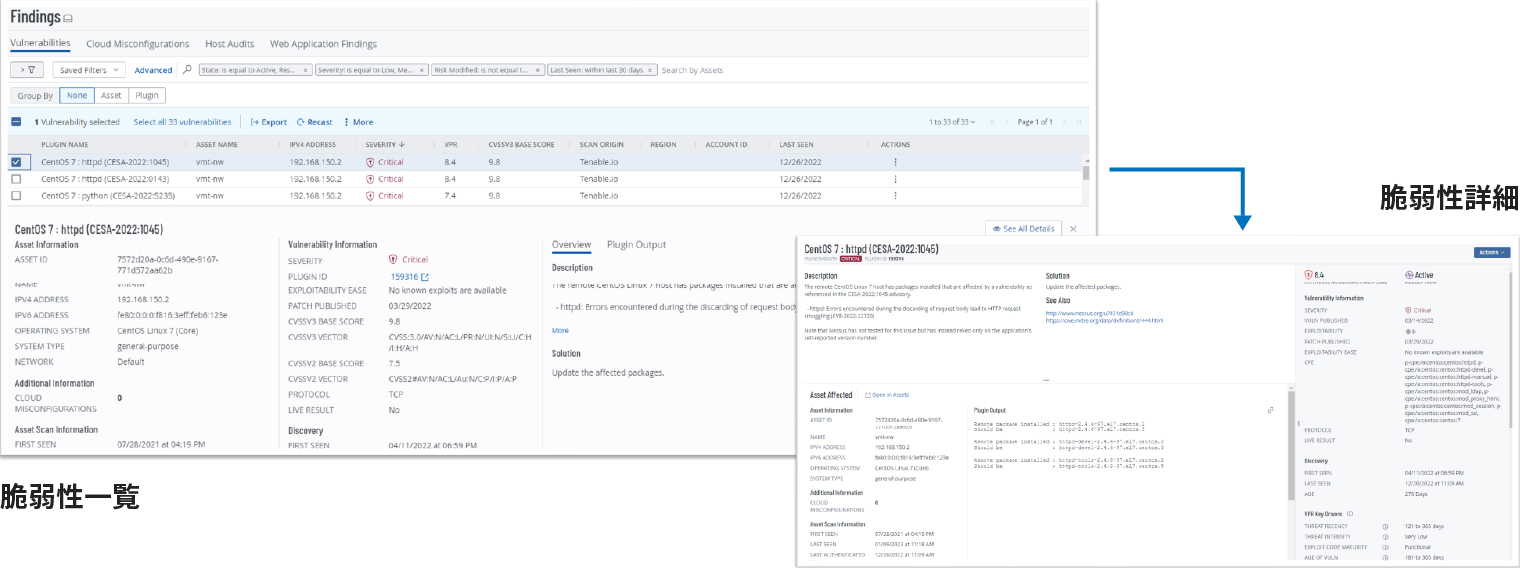 - ドリルダウンによって、危険性なアセット /脆弱性などを詳細分析できます。