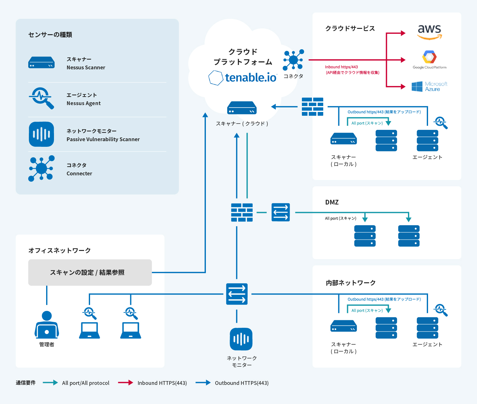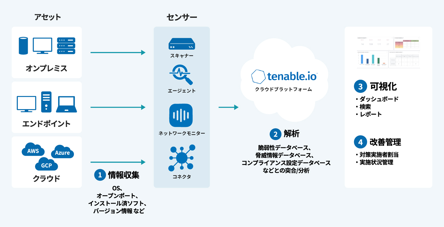 Tenable.io Cloud Platform上でセンサーが集めた情報と各種データベースを突合・分析します。