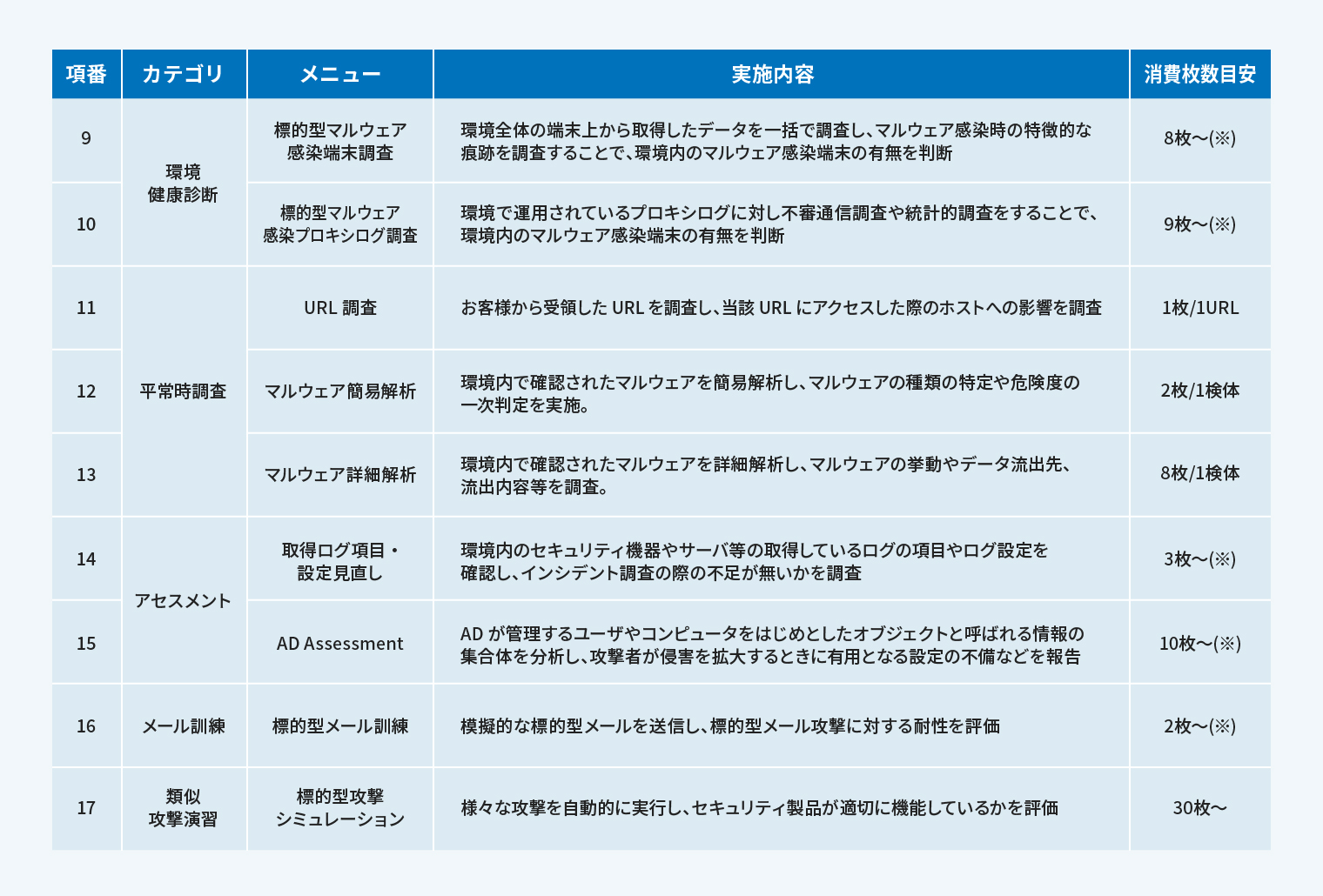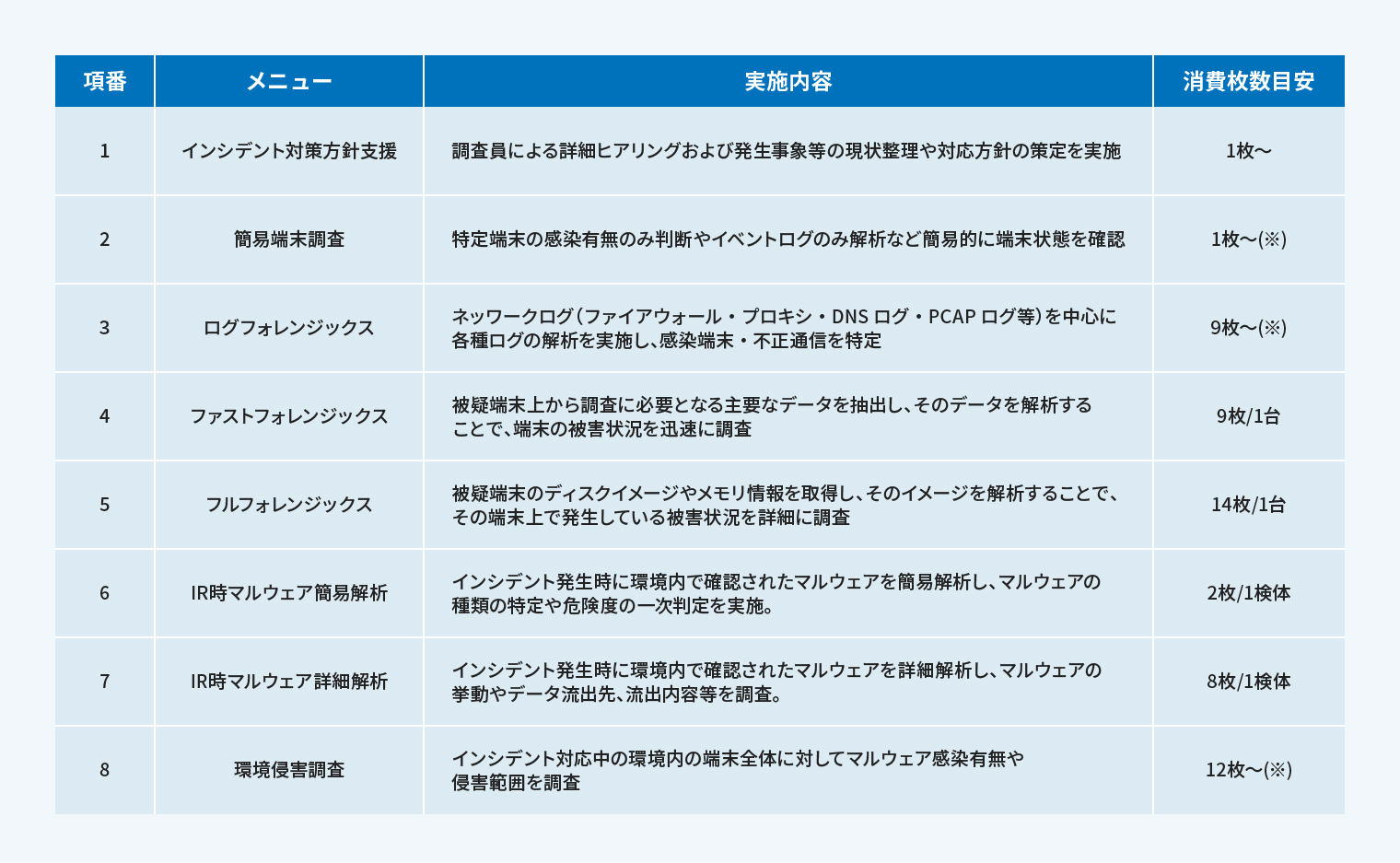 チケット枚数に応じて、初動対応から詳細なフォレンジック調査まで必要なサービスを組み合わせてご利用いただけます。