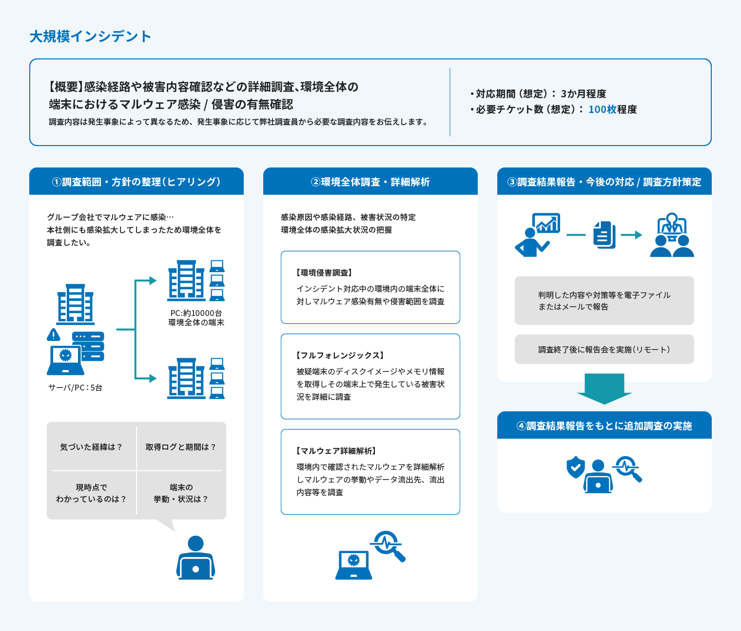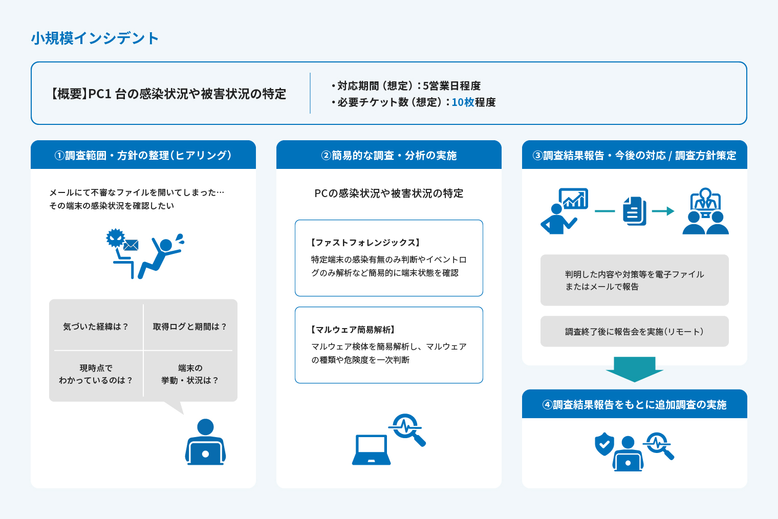 事前にチケットを購入・保有いただくことで、インシデント発生時の優先的な調査着手が可能となり、初動の遅れを防ぎます。