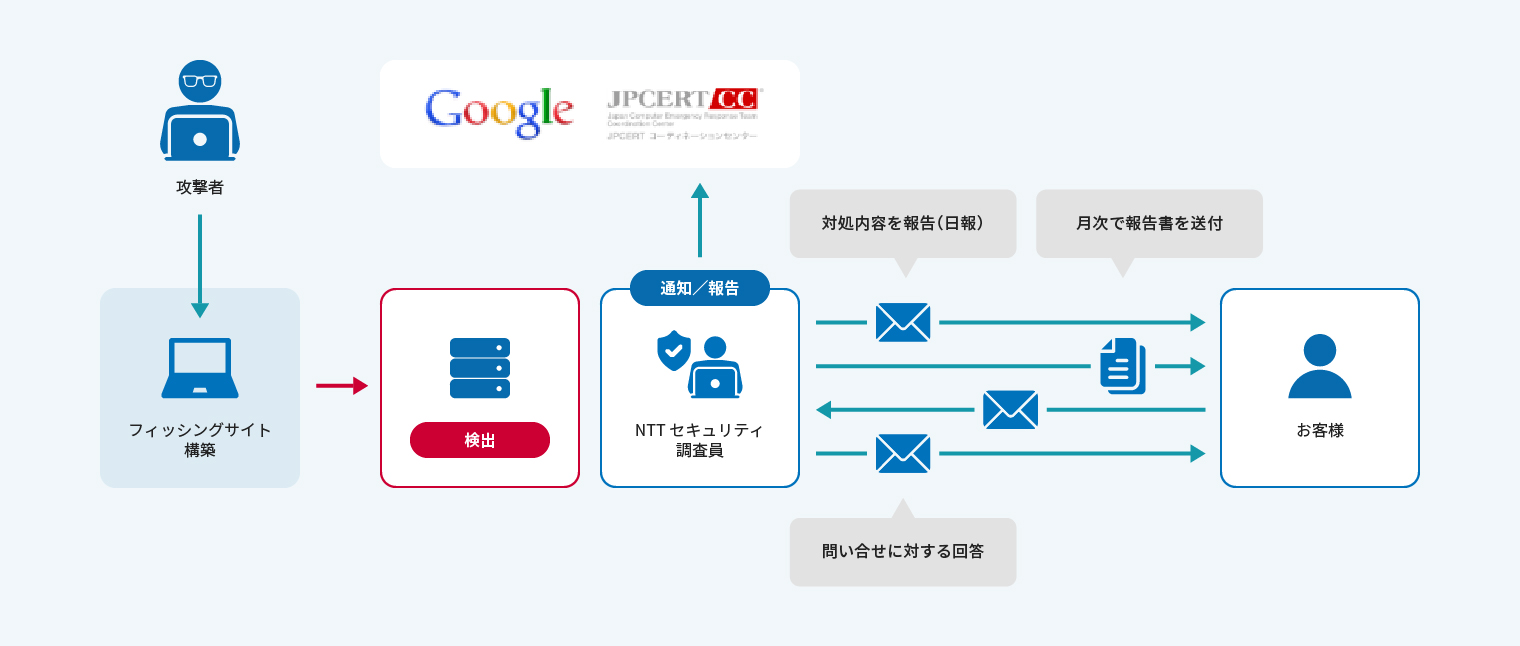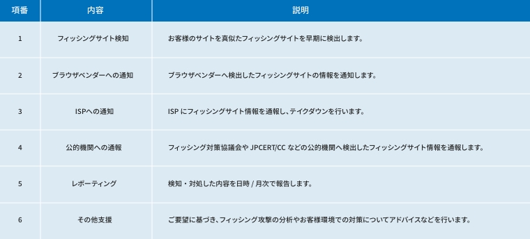 検出や対処内容、フィッシング攻撃の分析・対策アドバイスといった支援を通じ