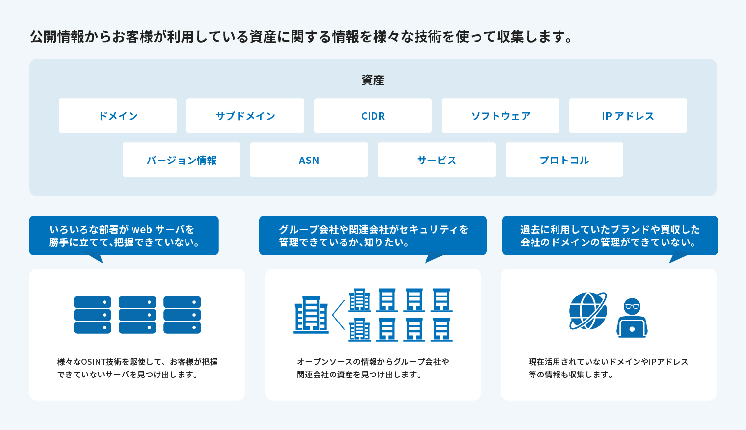 NTT研究所開発ツールにより、お客様が認識していない関連資産(ドメイン、IP、システムなど)をオープン情報から自動で徹底的に洗い出し、防御範囲を最大化します。