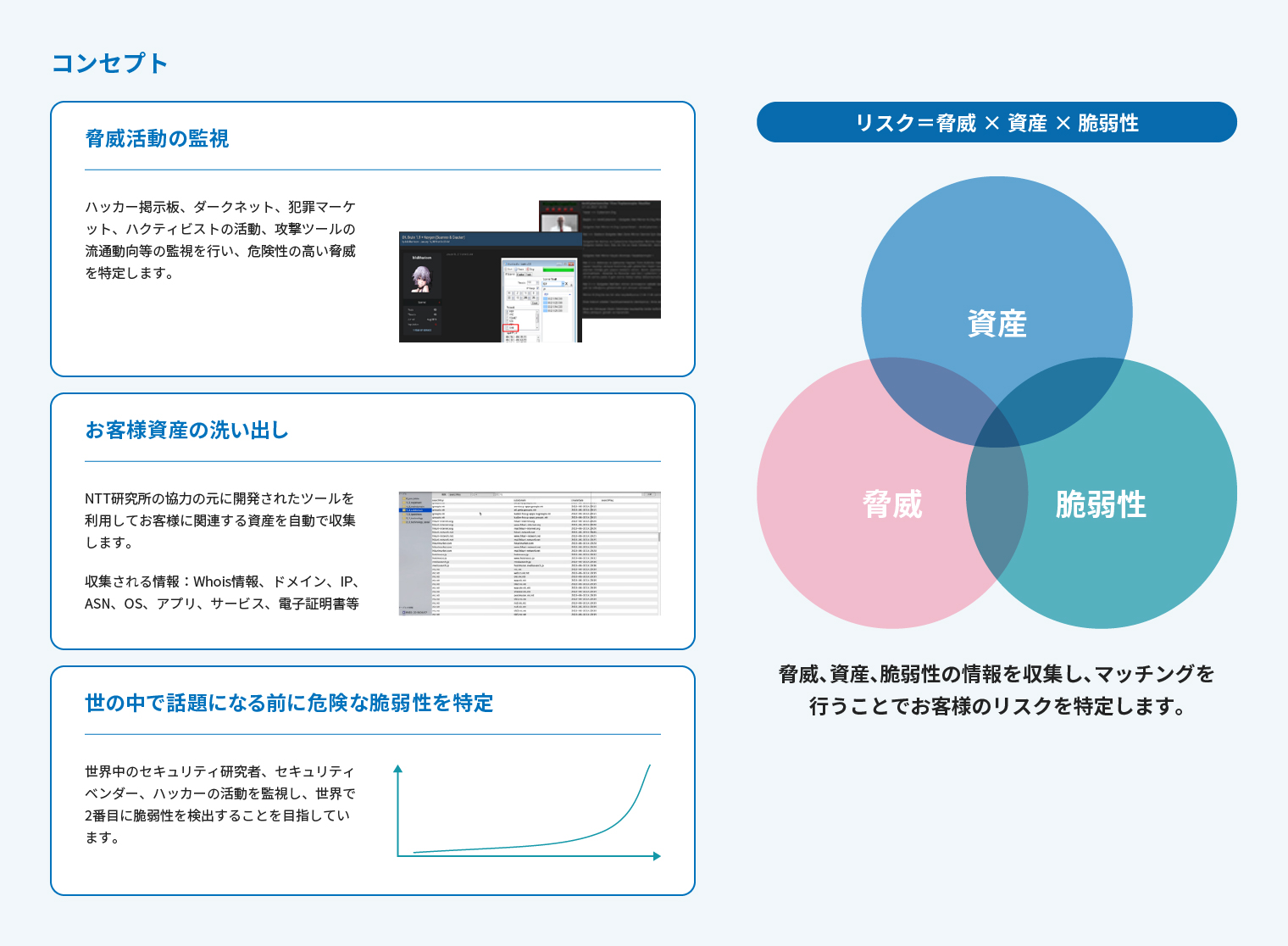 ハッカー掲示板、ダークネット、不正な情報売買マーケットなど、お客様自身ではアクセス不可能な領域まで監視範囲を広げ、収集した情報は、NTTセキュリティ・ジャパン独自の脅威インテリジェンスと分析ノウハウにより、お客様の「資産」に対する「脅威」と「脆弱性」をマッチングさせ、実効性の高い優先順位付けを行った上で報告します。